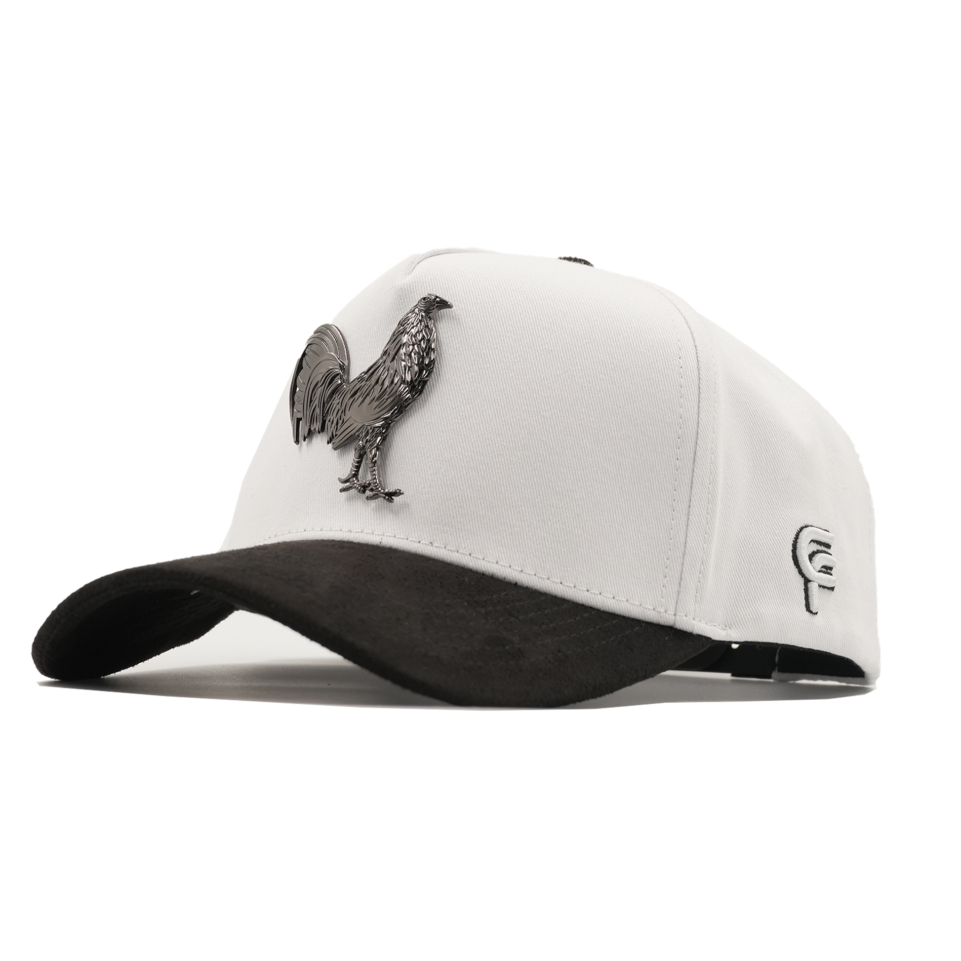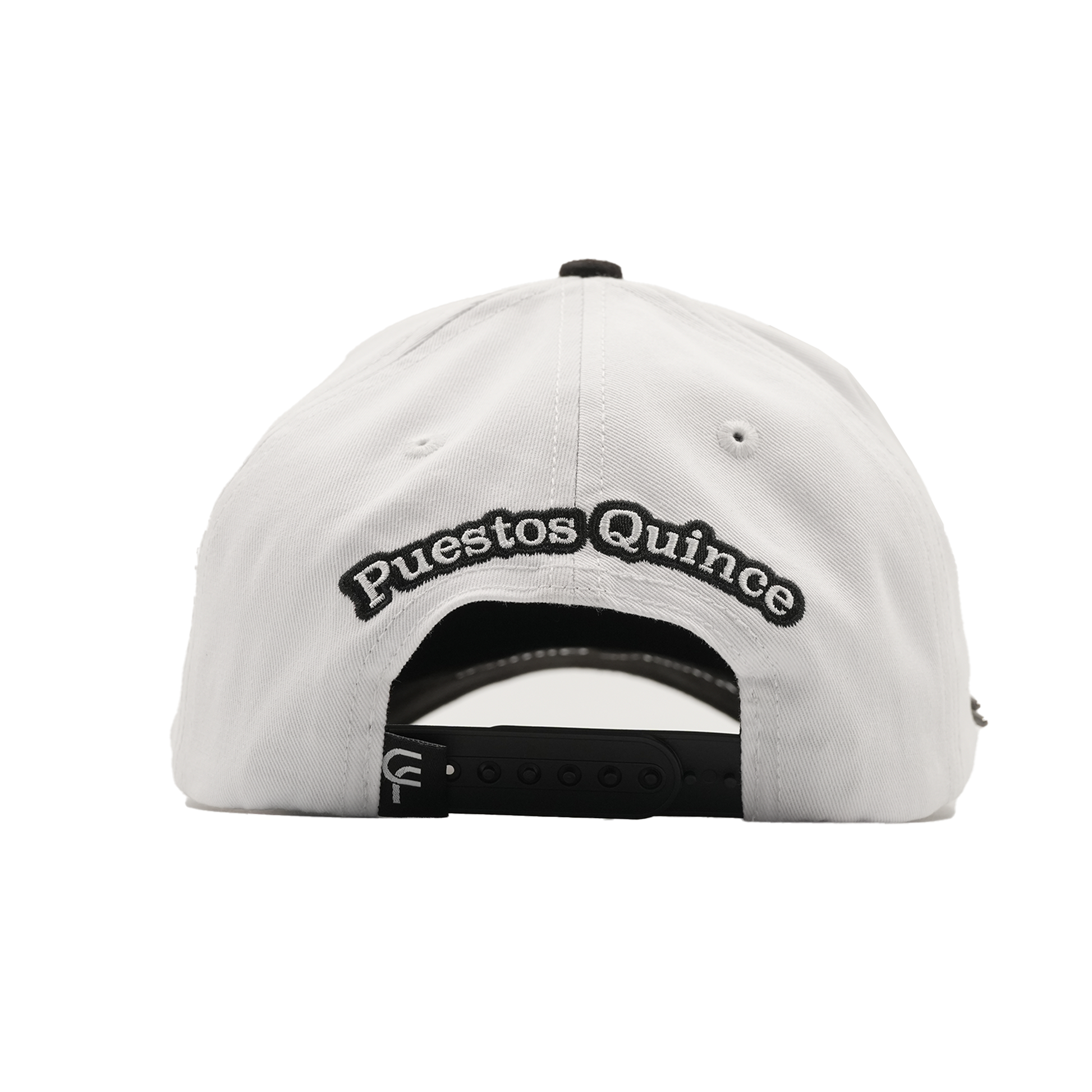 Gorra Curva Puestos Quince Clasica Blanca, Gallo Negro, con detalles bordados, TPU y Pin de Metal