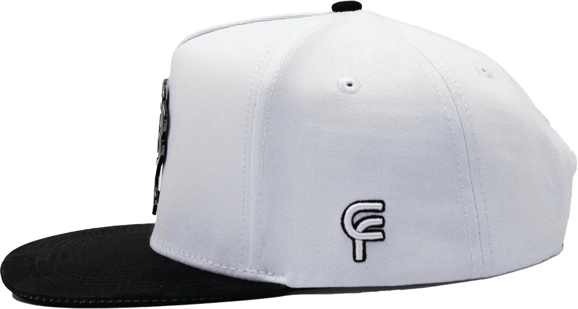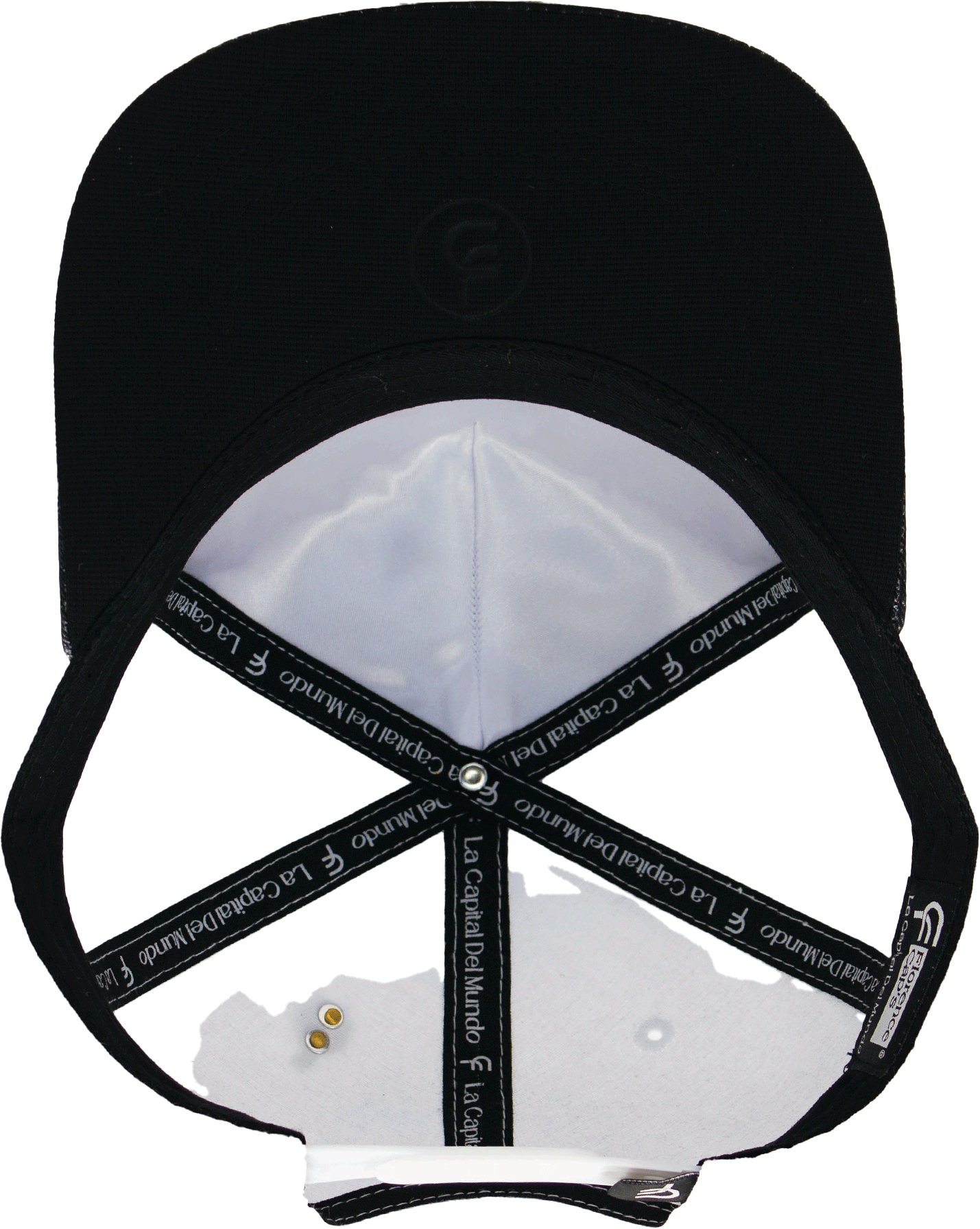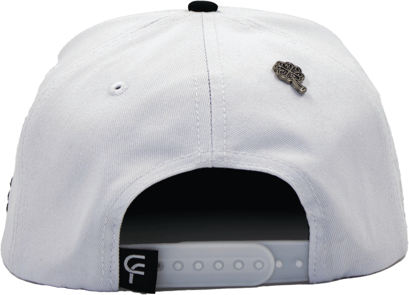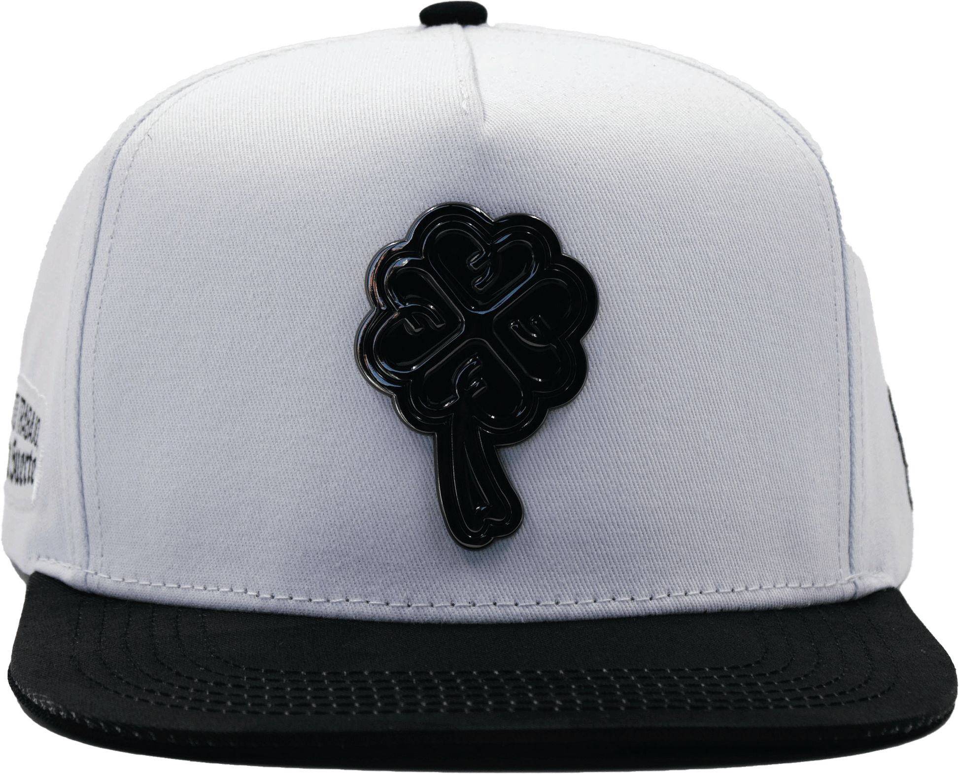 Elegante diseño de trébol negro sobre una gorra blanca con detalles negros, pieza que no debe faltar en tu colección.